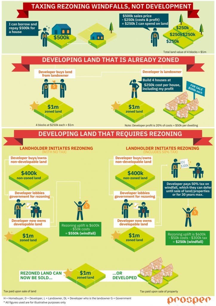 Will taxing rezoning windfalls push up house prices? The property industry says that taxing rezoning windfalls will increase the cost of housing because the tax will be passed on. They also say that in response to the new tax developers will shut up shop, reducing the number of new lots and houses that are available to buy.